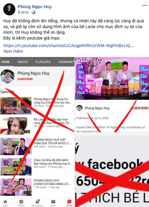 Chiều 8/6, Phùng Ngọc Huy lên tiếng trên trang cá nhân về việc bị kẻ xấu mạo danh trên YouTube và sử dụng hình ảnh bé Lavie để trục lợi bất chính. Theo đó, nam ca sĩ đã đăng đường link kênh YouTube giả mạo mang tên "Phùng Ngọc Huy" và cho biết mình chỉ sử dụng một kênh chính thức là "Phùng Ngọc Huy Official".