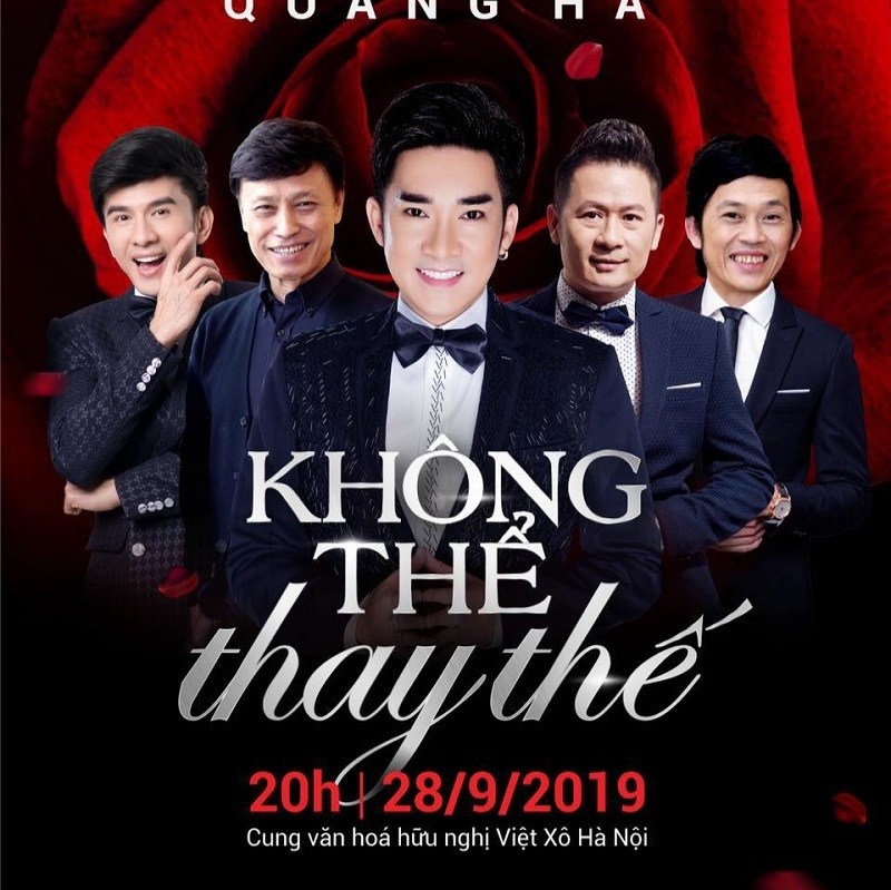 Theo dự kiến, liveshow ‘"Không thể thay thế" kỷ niệm 19 năm ca hát chuyên nghiệp của ca sĩ Quang Hà sẽ diễn ra trong hai ngày 28/9 và 29/9 tại Cung văn hóa Hữu nghị Việt Xô Hà Nội. Liveshow có sự tham gia của nhiều khách mời là những gương mặt đình đám như Hoài Linh, Tuấn Ngọc, Bằng Kiều, Đan Trường.