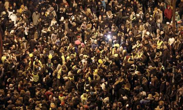 Một nhóm người biểu tình và khán giả mặc áo vàng xem đèn chiếu sáng trên Khải Hoàn Môn trước lễ kỷ niệm Ngày Năm Mới trên Đại lộ Champs Elysees, ở Paris. (Ảnh: Kamil Zihnioglu / AP)