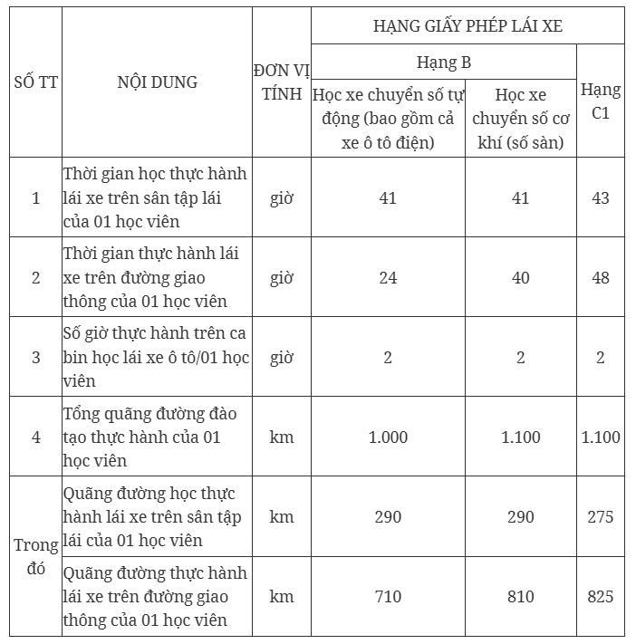 Theo Thông tư, chương trình, phân bổ thời gian đào tạo thực hành đào tạo lái xe các hạng B, C1 như sau: