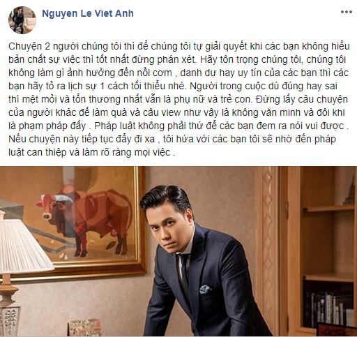 Tối 19/6, Việt Anh đăng tải bài viết trên trang cá nhân về chuyện ly hôn với vợ cũ. Anh viết: “Chuyện hai người chúng tôi thì để chúng tôi tự giải quyết, khi các bạn không hiểu bản chất sự việc thì tốt nhất đừng phán xét. Hãy tôn trọng chúng tôi. Chúng tôi không làm gì ảnh hưởng đến nồi cơm, danh dự hay uy tín của các bạn thì các bạn hãy tỏ ra lịch sự 1 cách tối thiểu nhé.