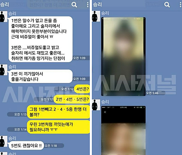 Trang Sisapress mới đây đã tung đoạn hội thoại Kakaotalk môi giới mại dâm của Seungri với các đối tác kinh doanh. Trong đoạn tin nhắn, Seungri đánh số các gái và miêu tả ngoại hình, tính cách, nghề nghiệp đồng thời cung cấp hình ảnh cho đối tác lựa chọn.