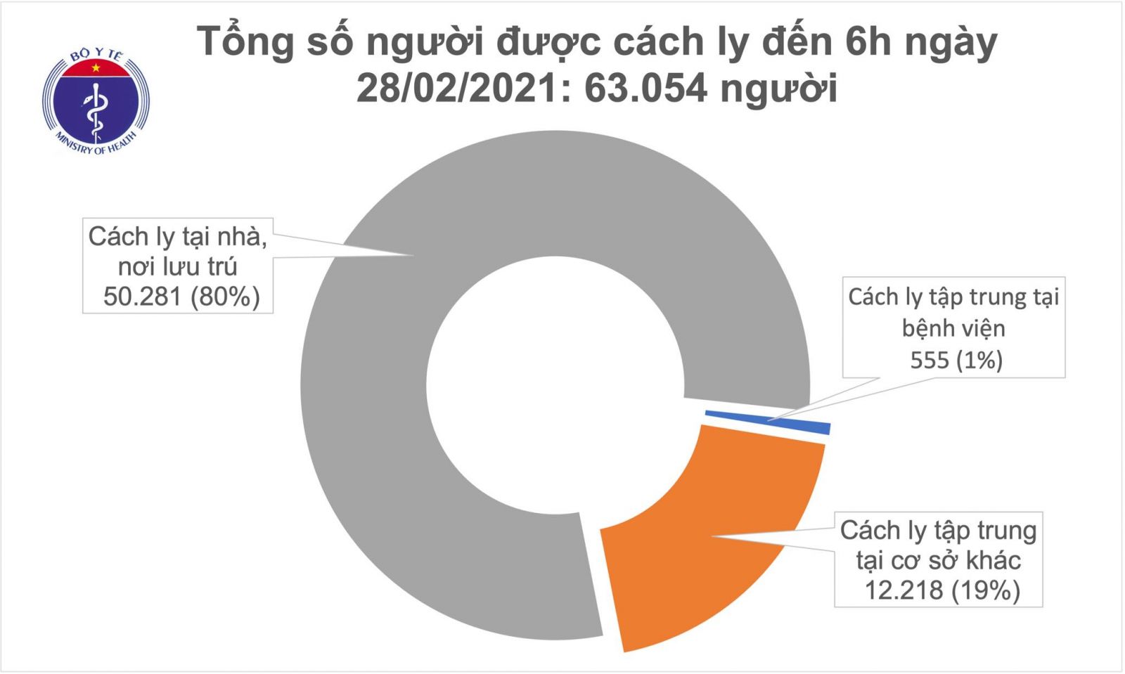 Tổng số người tiếp xúc gần và nhập cảnh từ vùng dịch đang được theo dõi sức khỏe (cách ly): 63.054, trong đó: - Cách ly tập trung tại bệnh viện: 555 - Cách ly tập trung tại cơ sở khác: 12.218 - Cách ly tại nhà, nơi lưu trú: 50.281.