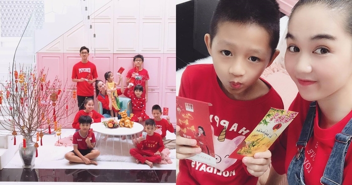 Ngọc Trinh cùng dàn cháu diện váy áo đỏ rực sáng mùng 1 Tết. Người đẹp chia sẻ vào ngày đầu năm mới, cô thường ở nhà đợi các cháu của mình sang chơi và mừng tuổi cho các bé. (Ảnh: FBNV)