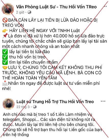 Theo Công an TP.Hà Nội, hiện nay trên mạng xã hội Facebook xuất hiện các tài khoản giả danh luật sư đăng bài hỗ trợ thu hồi tiền lừa đảo. Nhiều người bị lừa thay vì ra cơ quan Công an trình báo sự việc đã liên hệ các tài khoản giả danh luật sư với mong muốn được thu hồi tiền lừa đảo lại tiếp tục bị lừa thêm.