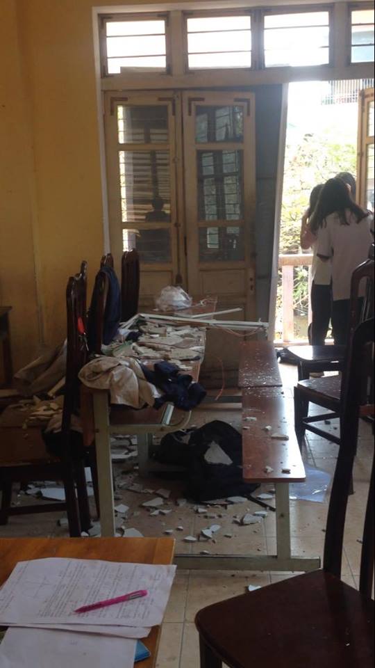 Bà Nguyễn Thị Minh Nguyệt - phó hiệu trưởng Trường THPT Trần Nhân Tông, Hà Nội cho hay giữa lúc học sinh đang học thì mảng vữa trên trần trong phòng hội đồng của nhà trường được sử dụng làm phòng học sập xuống khiến một số học sinh bị thương. Đây không phải lần đầu tiên xảy ra việc này.
