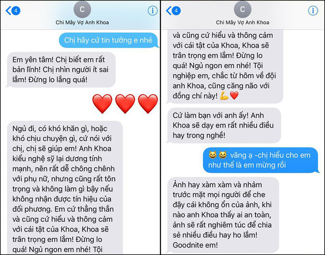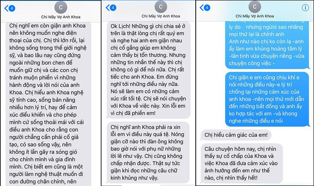 Trong tin nhắn, Mây Phạm chia sẻ khá dài, cô thừa nhận chồng sống bản năng, nhiều lần gây sóng gió gia đình. "Chị hiểu anh Khoa nghệ sĩ tính cao, sống bản năng nhiều hơn lý trí, hay để cảm xúc điều khiển và cho phép mình cứ sống thoải mái với cái điều anh Khoa cho rằng con người chẳng cần phải cố giả tạo, có sao sống vậy, nên không ít lần gây ra sóng gió cho chính mình và gia đình mình. Anh Khoa là kiểu nghệ sĩ lại dương tính mạnh, nên rất dễ chông chênh với phụ nữ, nhưng cũng rất tôn trọng và không làm gì bậy nếu không nhận được tín hiệu của đối phương. Em cứ thẳng thắn, cứ hiểu và thông cảm cho cái tật của Khoa".