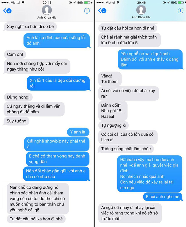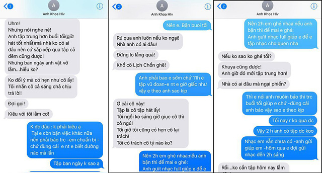 Các đoạn tin nhắn mà Phạm Lịch đưa ra thể hiện các nội dung mà cô đã "tố" Phạm Anh Khoa như gạ cô qua nhà tập đêm, gọi cô bằng biệt danh có nghĩa thô tục, có lời lẽ xúc phạm cô trong lần trò chuyện cuối cùng...