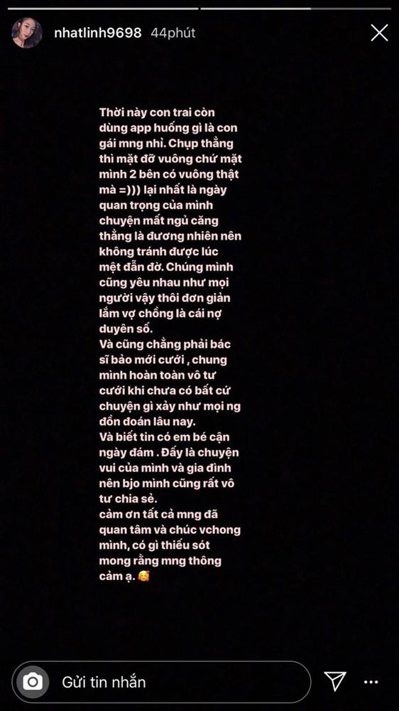 Hôm qua, ngày 30/1 (mùng 6 Tết Nguyên đán), Văn Đức và Nhật Linh đã tổ chức hôn lễ tại quê nhà Nghệ An. Ngay sau đó, trên trang cá nhân của mình, Nhật Linh bất ngờ chia sẻ: “Chúng mình cũng yêu nhau như mọi người vậy thôi, đơn giản lắm, vợ chồng là cái nợ duyên số. Cũng chẳng phải bác sĩ bảo cưới, chúng mình hoàn toàn vô tư cưới khi chưa có bất cứ chuyện gì xảy ra như mọi người đồn đoán lâu nay. Mình biết tin có em bé cận ngày đám. Đấy là chuyện vui của mình và gia đình nên bây giờ mình cũng rất vô tư chia sẻ…".