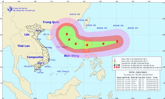 Theo thông tin từ trung tâm Dự báo Khí tượng Thủy văn Trung ương, hiện nay (28/10), trên vùng biển Tây Bắc Thái Bình Dương có một siêu bão hoạt động mạnh có tên quốc tế là Yutu.