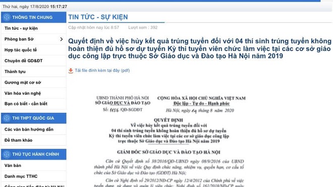 Cũng trong ngày hôm nay (17/8), Sở GD-ĐT Hà Nội đã có quyết định công nhận kết quả trúng tuyển đối với 2 thí sinh dự tuyển có kết quả tuyển dụng thấp hơn, liền kề so với kết quả tuyển dụng của các thí sinh đã bị hủy kết quả trúng tuyển.