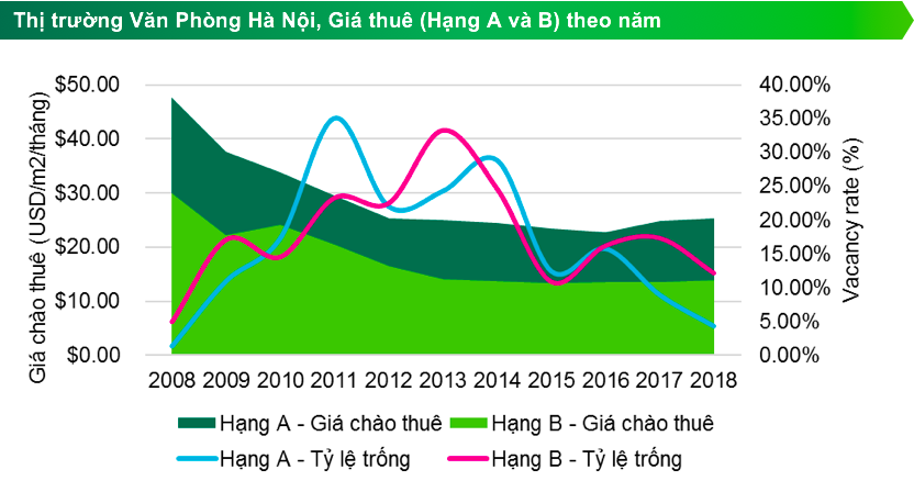 Theo báo cáo tháng IV/2018 của CBRE, tỷ lệ hấp thụ thị trường văn phòng Hà Nội đạt con số kỉ lục 100.000 m2, mức cao nhất trong vòng ba năm gần đây. Tỷ lệ trống của văn phòng hạng A và B đều giảm lần lượt từ 4,6 % và 5,2% xuống còn 4,3% và 12,2% so với cùng kì – mức thấp kỉ lục trong vòng 10 năm qua. Tỉ lệ trống thấp, trong khi nhu cầu thuê mặt bằng vẫn tăng lên đều đặn qua từng năm, dẫn tới chi phí thuê mặt bằng tại khu vực trung tâm Hà Nội tăng cao.