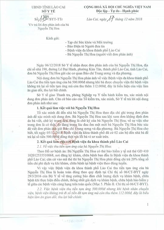 Theo đó, ngày 17/12/2018 Phó Giám đốc Sở Y tế tỉnh Lào Cai - Hoàng Quốc Hương gửi Văn bản số 1790 tới Tòa soạn PhapluatNet về kết quả thanh, kiểm tra nội dung mà PhapluatNet đã phản ánh trước đó. Văn bản trả lời của Sở Y tế tỉnh Lào Cai xác nhận bệnh viện thu tiền tạm ứng của bà Nguyễn Thị Hoa 500.000 đồng nhưng khi chuyển viện, bệnh viện không trừ đi số tiền đã tạm ứng mà còn thu thêm 112.000 đồng là đúng như trong đơn phản ánh nhưng không có biểu hiện làm ăn gian dối, bất chính.