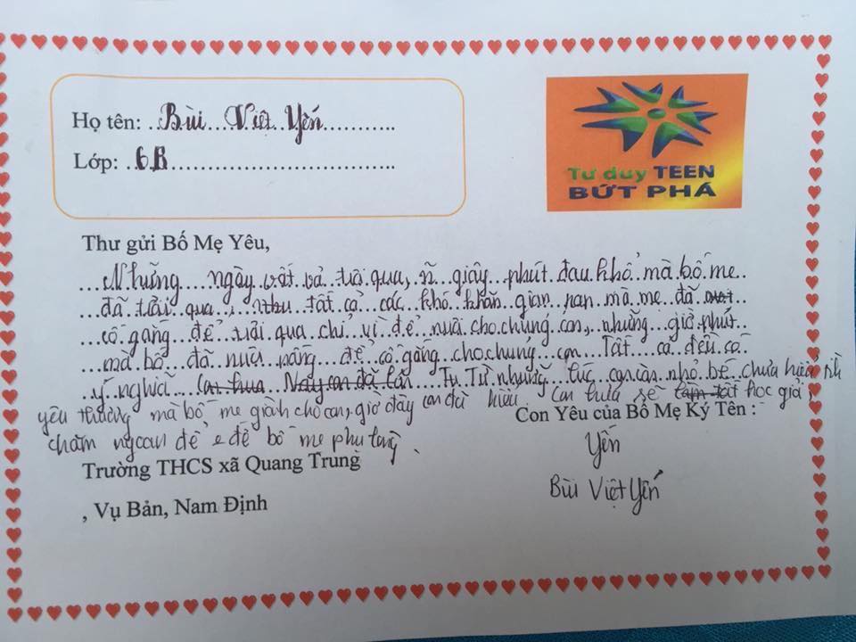 Tự đáy lòng mình, các em học sinh đã nói được và viết ra những dòng cảm xúc, biết ơn và tự hào về cha mẹ, thầy cô và những người xung quanh. Những giọt nước mắt vẫn còn chưa kịp khô trên những trên trang thư để nói rằng: “Gia đình là nơi cuộc sống bắt đầu và là tình yêu không bao giờ kết thúc”.