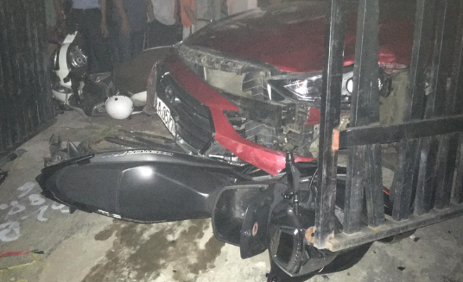 Sau cú va chạm, xe ô tô tiếp tục lao lên vỉa hè đâm vào 2 chiếc xe máy đang để trên đường. Vụ va chạm làm xe ô tô và 4 xe máy bị hư hỏng nặng.