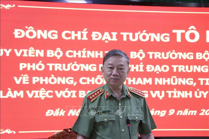 Tại buổi làm việc, Đại tướng Tô Lâm biểu dương các kết quả của tỉnh Đắk Nông trong phòng, chống, kéo giảm các loại tội phạm, đồng thời lưu ý tỉnh cần chú trọng hơn nữa trong xây dựng thế trận an ninh nhân dân; ngành công an tiếp tục đẩy mạnh công tác cải cách hành chính, tạo mọi thuận lợi cho người dân trong việc thực hiện các thủ tục hành chính. Đối với công tác phòng, chống tham nhũng, tiêu cực, tỉnh cần tập trung thực hiện nghiêm túc các chủ trương, chính sách của Đảng và Nhà nước về lĩnh vực này.