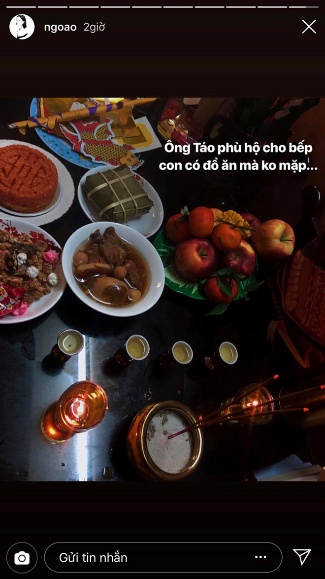 Én vàng Liêu Hà Trinh tự tay gói bánh chưng cúng ông Công ông Táo trưa 30 Tết. Trên trang cá nhân, cô chia sẻ nhiều hình ảnh các công đoạn làm bánh chưng. Kèm theo hình ảnh, cô viết một cách hài hước: "Ông Táo phù hộ cho bếp con có đồ ăn mà không mập".