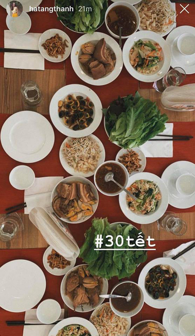 Tăng Thanh Hà khoe ảnh mâm cơm tất niên hoành tráng, đầy đủ các món ăn truyền thống như thịt kho hột vịt, củ kiệu trứng bách thảo, dưa món, dưa giá... Cách đây vài ngày, cô hé lộ hình ảnh căn biệt thự được trang trí nhiều loại hoa Tết như đào, mai, cúc...