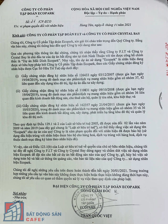 Trước đó, ngày 26/1/2021, Tập đoàn Ecopark (Ecopark) đã gửi văn bản số 21 yêu cầu: "Công ty F.I.T và Công ty Crystal Bay chấm dứt việc sử dụng nhãn hiệu Ecopark để đặt tên cho bất cứ dự án bất động sản nào của quý Công ty; gỡ, huỷ bỏ việc sử dụng toàn bộ và bất cứ thông tin quảng cáo, văn bản tài liệu nào của quý Công ty... sử dụng nhãn hiệu Ecopark".