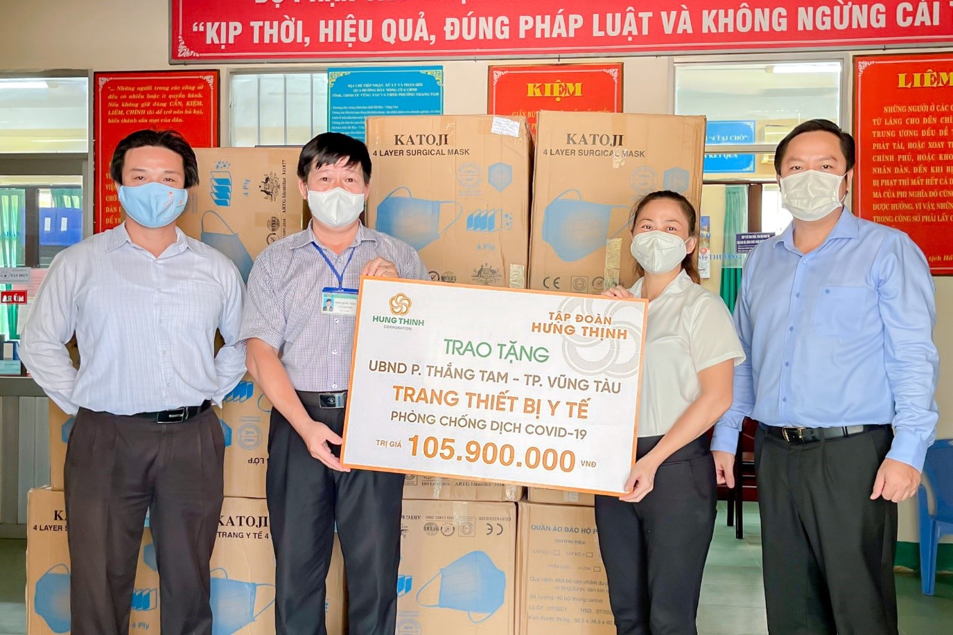 Cũng trong sáng 20/9, Tập đoàn Hưng Thịnh đã trao tặng gói trang thiết bị y tế hơn 100 triệu đồng cho UBND P.Thắng Tam, TP.Vũng Tàu với mong muốn tiếp thêm nguồn lực cho hoạt động chống dịch Covid-19 tại đây.