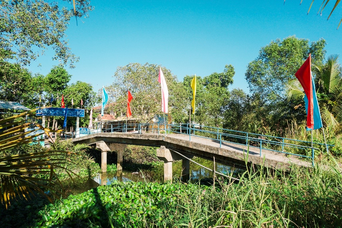 Nằm ẩn mình sau con kênh tại xã Bình Đức, trường Tiểu học & THCS Bình Đức đang có khoảng 300 em học sinh đang học tập tại đây. Theo chia sẻ của lãnh đạo địa phương, cây cầu kết nối giữa trường và giao lộ có tuổi đời hơn 20 năm. Sau một thập kỷ gắn bó cùng bao thế hệ học sinh nơi đây, hiện nay cây cầu đang có dấu hiệu xuống cấp, gây nguy hiểm cho các em học sinh khi đây là con đường duy nhất để di chuyển.