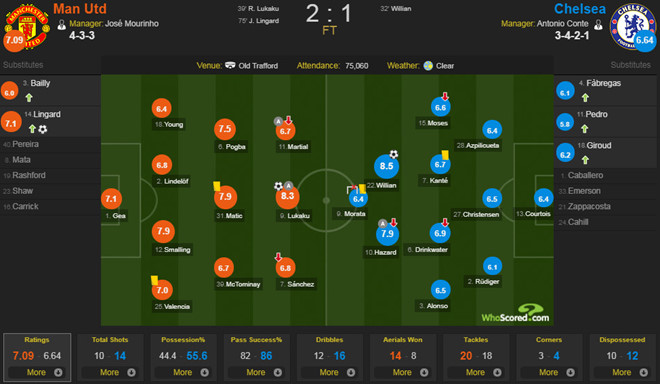 Đến phút 32, may mắn đã không còn đứng về phía đội chủ nhà. Từ tình huống phối hợp phản công sắc sảo với Hazard, Willian phá bẫy việt vị thoát xuống và dễ dàng đánh bại De Gea ở thế đối mặt với một cú sút quyết đoán.