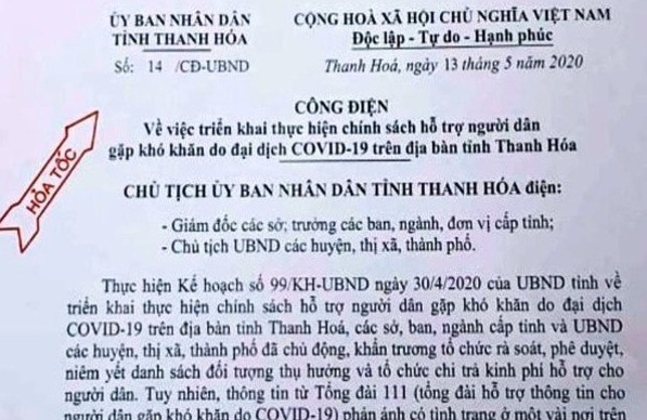 Sáng ngày 13/5, ông Mai Xuân Liêm, Phó Chủ tịch UBND tỉnh Thanh Hóa, đã ký Công điện số 14/CĐ-UBND truyền đạt ý kiến chỉ đạo của Chủ tịch UBND tỉnh Thanh Hoá về việc triển khai thực hiện chính sách hỗ trợ người dân gặp khó khăn do đại dịch Covid-19 trên địa bàn.