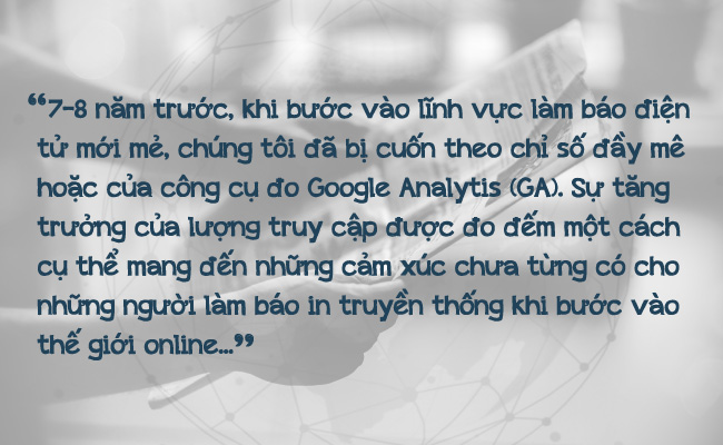 Trong một bài trả lời phỏng vấn đăng trên số tết báo Công luận hồi đầu năm 2019 , tôi có thú nhận: “7-8 năm trước, khi bước vào lĩnh vực làm báo điện tử mới mẻ, chúng tôi đã bị cuốn theo chỉ số đầy mê hoặc của công cụ đo Google Analytis(GA).Sự tăng trưởng của lượng truy cập được đo đếm một cách cụ thể mang đến những cảm xúc chưa từng có cho những người làm báo in truyền thống khi bước vào thế giới online. Hệ lụy là phóng viên say mê với thủ thuật để tăng view mà xa rời những kỹ năng cơ bản và quan trọng nhất của người làm báo-viết,quay, chụp, biên tập,tác nghiệp lấy thông tin hiện trường, phỏng vấn hay tường thuật”.