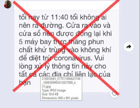 Được biết, cùng ngày, trên mạng xã hội đã đăng tải thông tin có nội dung như sau: "Tối nay (26/7), từ 11 giờ 40 tối không ai nên ra đường. Cửa ra vào và cửa sổ nên được đóng lại khi 5 máy bay trực thăng phun chất khử trùng vào không khí để diệt trừ coronavirus".