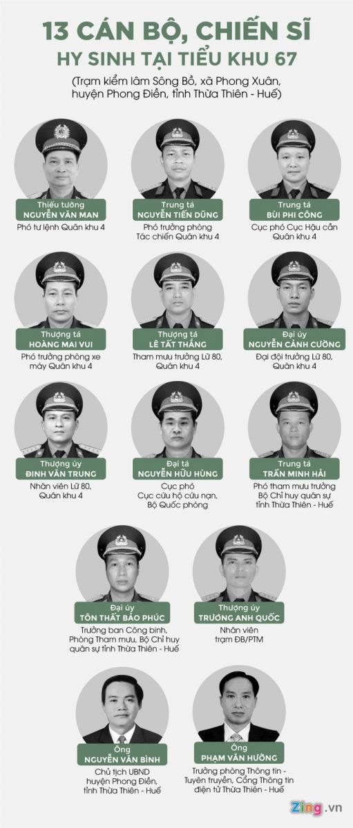 Trước đó, đêm 11/10, mưa lớn khiến cả nửa quả núi sạt xuống nhà điều hành thủy điện Rào Trăng 3, vùi lấp nhiều công nhân. Nhận thông tin, chiều 12/10, đoàn công tác 21 người tiến vào thủy điện Rào Trăng 3 để tìm kiếm cứu nạn. Đêm cùng ngày, đoàn đến tiểu khu 67, trạm kiểm lâm Sông Bồ và dừng nghỉ tại đây. Lúc 0h ngày 13/10, sau tiếng nổ lớn, núi đất đá sụt trùm lên các gian nhà đoàn đang nghỉ; 8 người thoát ra ngoài, 13 người bị vùi lấp dưới đất bùn. Đến này 15/10, bộ Tư lệnh Quân khu 4 và các lực lượng đã tìm thấy thi thể 13 người gặp nạn.