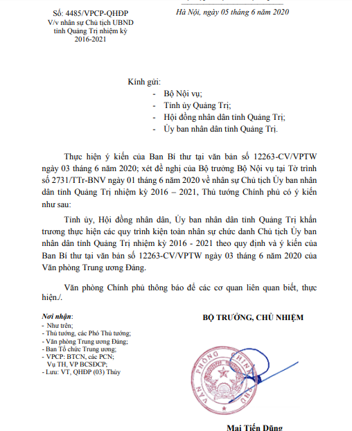 Ngày 6/6, Văn phòng UBND tỉnh Quảng Trị cho biết đã nhận được văn bản số 4485/VPCP-QHĐP của Văn phòng Chính phủ phát đi ngày 5/6, thông báo ý kiến của Thủ tướng Chính phủ liên quan đến nhân sự Chủ tịch UBND tỉnh Quảng Trị nhiệm kỳ 2016 - 2021.