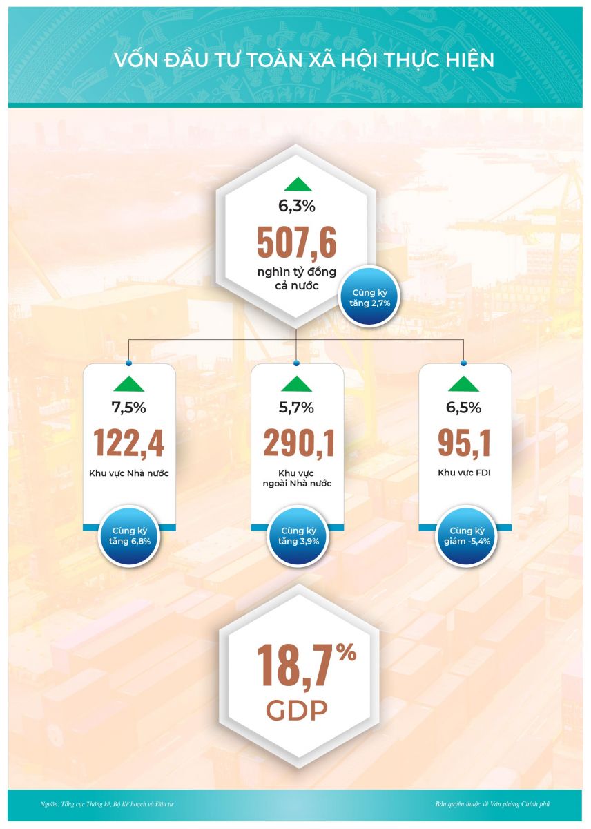 Vốn đầu tư phát triển tăng khá, đạt 6,3%, tạo động lực thúc đẩy tăng trưởng (Vốn đầu tư công tăng 13%, đạt 15% kế hoạch; vốn đầu tư khu vực ngoài Nhà nước tăng 5,7%; vốn FDI thực hiện tăng 6,5%). Tổng vốn FDI cấp mới, điều chỉnh và góp vốn, mua cổ phần đạt trên 10 tỷ USD, tăng 18,5%. Đầu tư của doanh nghiệp Việt Nam ra nước ngoài tăng 6 lần. Doanh nghiệp thành lập mới tăng 27,5% vốn đăng ký. Thu, chi NSNN đạt kết quả tích cực (thu ngân sách bằng 23,8% dự toán).