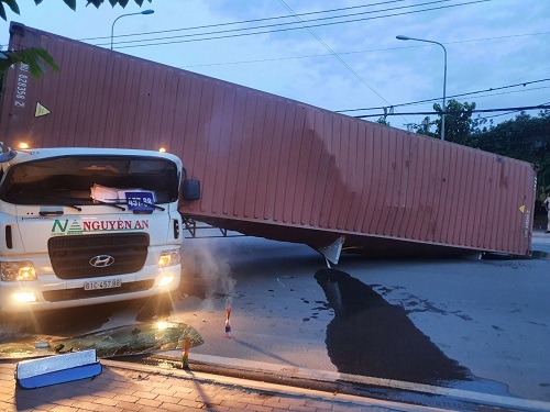 Khi chạy tới một ngã 3 gần cuối đường, anh Thắng cho xe quay đầu lại. Tuy nhiên, vì thùng container quá dài, trong khi khúc quay đầu hẹp nên thùng container bị rớt một phần xuống đường, phần còn lại đè lên cabin. Sức nặng của thùng container chứa hàng đã đè bẹp cabin khiến tài xế Thắng tử vong tại chỗ.