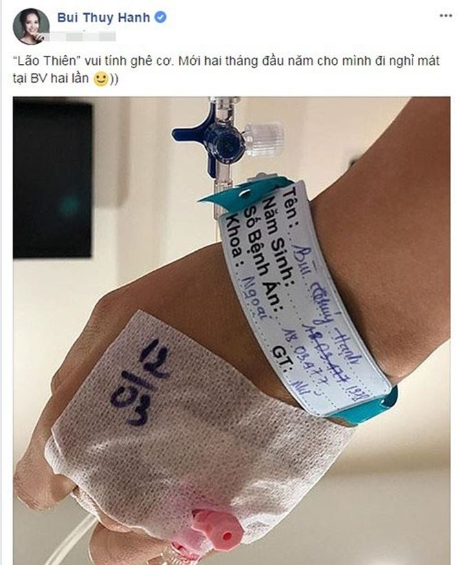 Mới đây, cựu người mẫu, MC Thúy Hạnh tiếp tục làm người hâm mộ phải lo lắng khi chia sẻ hình ảnh đang phải nằm viện ở khoa ngoại trên trang cá nhân. Cô viết: "Mới hai tháng đầu năm cho mình đi nghỉ mát tại bệnh viện hai lần".