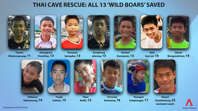 Như vậy, sau hơn hai tuần mắc kẹt trong hang Tham Luang, tỉnh Chiang Rai, tất cả 13 người thuộc đội bóng đều đã sống sót trở ra. Nhà chức trách Thái Lan hiện đưa họ tới bệnh viện để theo dõi tình hình sức khỏe.