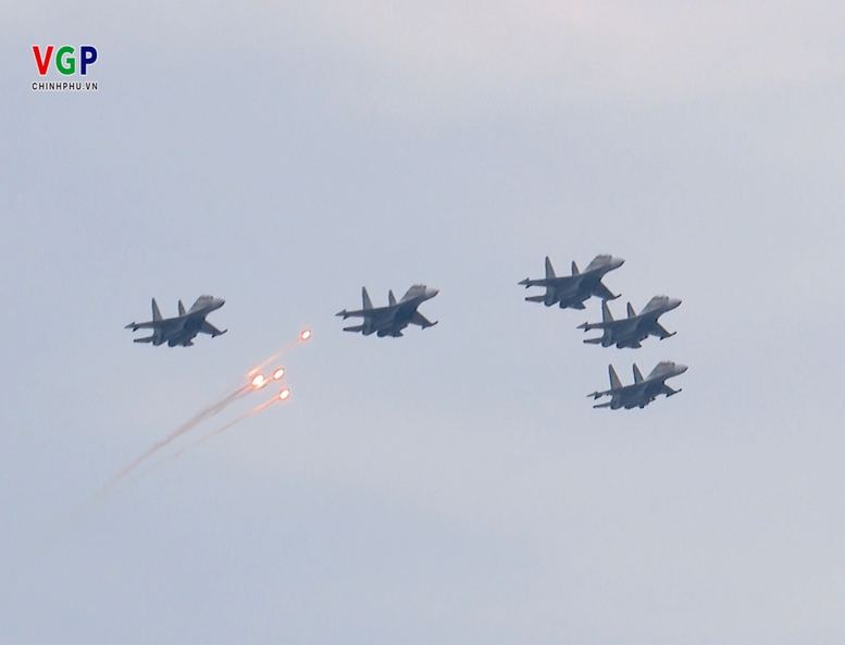 Mở đầu tổng duyệt diễu binh, diễu hành là các Biên đội của Không quân nhân dân Việt Nam anh hùng bay trên bầu trời Quảng trường Ba Đình. Dẫn đầu là biên đội trực thăng Mi-171, Mi-17, Mi-8, mang cờ Đảng, cờ Tổ quốc. Tiếp theo là đội hình máy bay vận tải Casa C-295 và C212i, đội hình máy bay huấn luyện Yak-130 và L-39NG, cuối cùng là đội hình máy bay tiêm kích đa năng siêu âm hiện đại Su-30MK2.