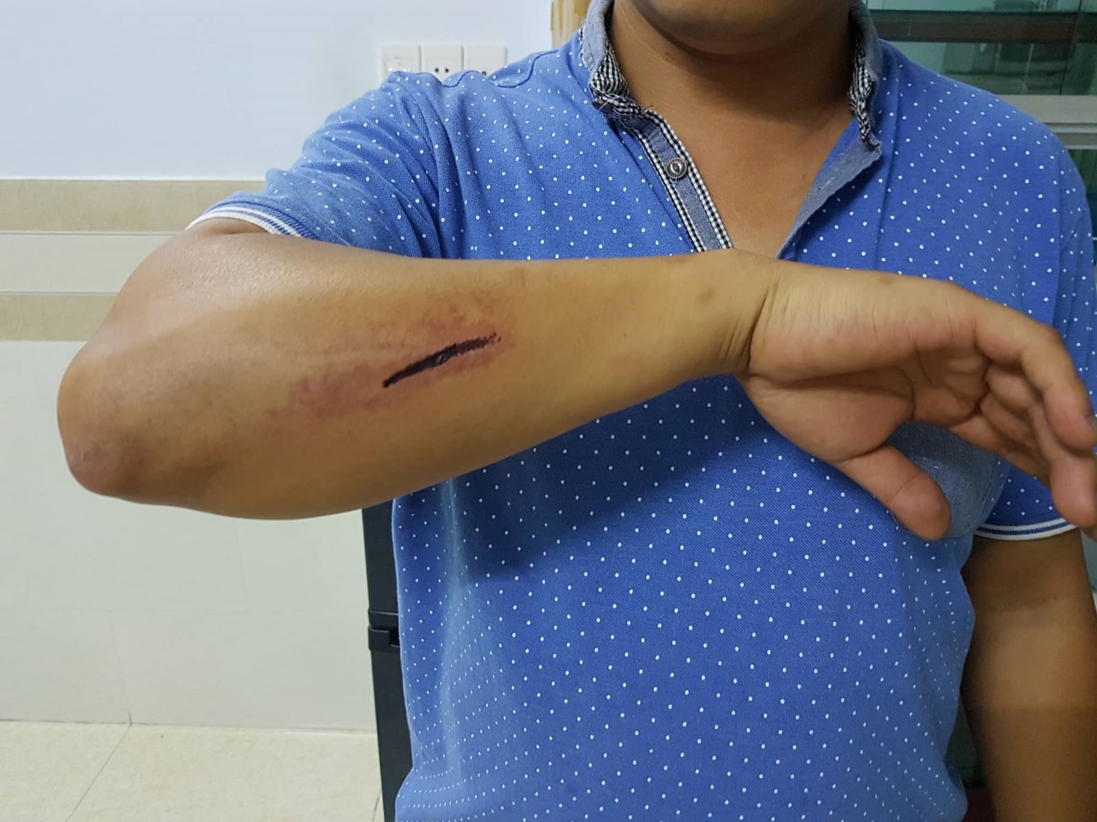 "Những tưởng chỉ là lời nói đe dọa, tôi vẫn tiếp tục đứng đầu xe và yêu cầu tài xế taxi Vinasun xuống xe để giải quyết thì bất ngờ tài xế xe 51G.314.03 nhấn ga húc thẳng vào người tôi khiến bánh xe chèn qua bàn chân trái rồi rồ ga bỏ chạy dù trong xe vẫn đang chở khách. Trước cách hành xử côn đồ, thiếu trách nhiệm của tài xế xe taxi, tôi liền điều khiển xe đuổi theo để yêu cầu dừng xe, đuổi theo đến đoạn nút giao với đường Song Hành thì tôi đã chặn được đầu xe taxi. Khi thấy tôi xuống xe, tài xế taxi một lần nữa cố tình điều khiển xe để đâm vào người tôi, rất may là tôi tránh kịp, không thì đã nằm dưới gầm xe của tài xế taxi rồi”.