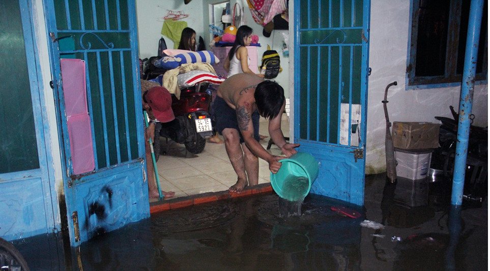 Để ngăn nước vào nhà, anh Nguyễn Văn Mạnh đã làm một bậc gạch trước cửa, cao khoảng 0,4 m. Thế nhưng triều cường rạng sáng 9/10 lên nhanh khiến nước tràn vào phòng trọ. Anh Mạnh phải dùng xô múc nước từ phòng đổ ra ngoài, tránh hư hỏng đồ dùng.