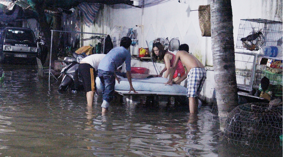 Vào 3h sáng ngày 9/10, triều cường dâng cao khiến hàng loạt hộ dân có nền nhà thấp ở bán đảo Thanh Đa, quận Bình Thạch (TP.HCM), bị nước tràn vào. Người dân phải thức dậy giữa khuya, lấy ván cùng nhiều vật dụng khác ngăn không cho nước tràn vào nhà vừa tát nước ra ngoài.