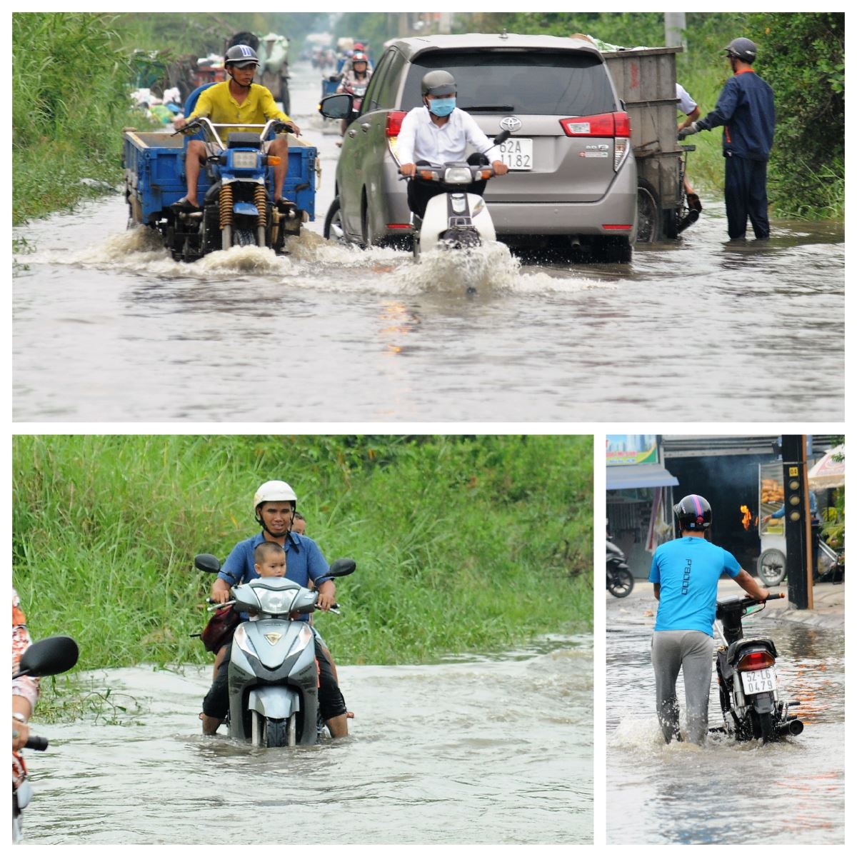 Cảnh ngập nặng do triều cường hơn nửa mét nước khiến hàng loạt phương tiện chết máy. Tương tự, đường Lê Văn Lương (xã Phước Kiểng) nước ngập mênh mông, kéo dài nhiều km. Dòng nước đen từ cống trào ngược lên mặt đường, bốc mùi hôi thối nồng nặc khiến người dân vừa phải chạy xe, vừa lấy tay che kín miệng.