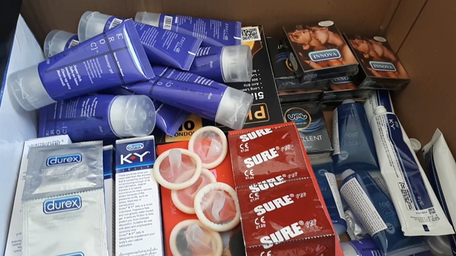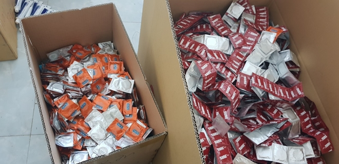 Tại hiện trường lực lượng đã phát hiện được 163.000 sản phẩm bao cao su các loại mang thương hiệu Durex, Inova, Sure, Ok xuất xứ Malaysia, Thái Lan; trên 118.000 vỏ bao bì các loại, tem nhãn tiếng Việt ghi sản xuất tại Indonesia, Malaysia; 60kg dung dịch lỏng cùng 1 phễu chiết rót bằng tay…