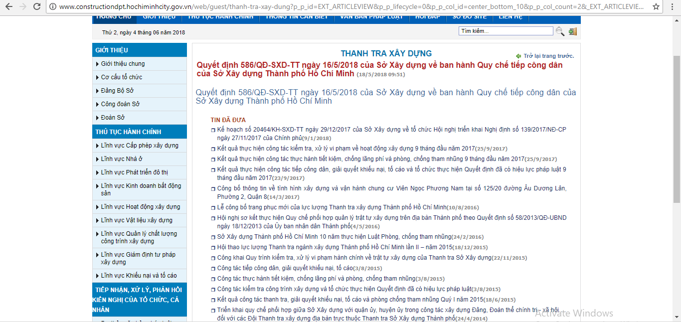 Liên quan đến hoạt động kiểm tra, xử lý vi phạm trong lĩnh vực xây dựng, tra cứu thông tin tại cổng thông tin chính thức của Sở Xây dựng, PV được biết, đối với hoạt động thanh tra xây dựng thì hiện nay đã là tháng 6/ 2018, nhưng các kết quả kiểm tra đối với các công trình xây dựng của Sở này được đăng tải một cách công khai vẫn chỉ dừng lại ở mốc thời gian 25/9/2017. Không rõ trong một thời gian dài kể từ tháng 9/2017 đến nay các hoạt động kiểm tra của lực lượng thanh tra xây dựng trên địa bàn có được diễn ra thường xuyên hay không?
