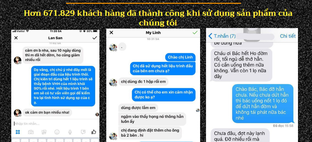 Kèm theo đó là hàng loạt tin nhắn, chia sẻ của khách hàng nhận xét về sản phẩm, trước khi sử dụng sản phẩm thì khổ sở về bệnh tật như thế nào, khi sử dụng sản phẩm một thời gian thì bệnh tình thuyên giảm, khỏi hẳn các triệu chứng do bệnh gây ra. Đó cũng chính là lý do để nhân vật viết thư cảm ơn, chia sẻ với người khác. Để thêm tính thuyết phục, những bài chia sẻ đều có tên, tuổi, địa chỉ, hình ảnh cụ thể của khách hàng đã sử dụng sản phẩm.