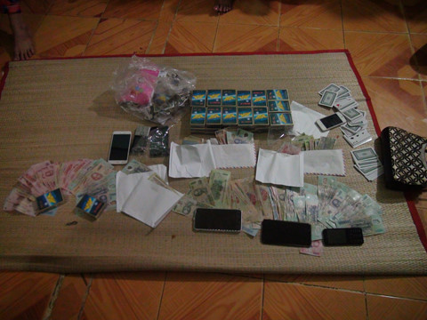 Công an tạm giữ tại hiện trường 15 nghi can, 34 triệu đồng tiền mặt, 5 bộ bài đã qua sử dụng, 21 bộ còn mới, nhiều điện thoại di động, xe máy cùng một số tang vật khác có liên quan. Trong số các nghi can có đến 12 phụ nữ.