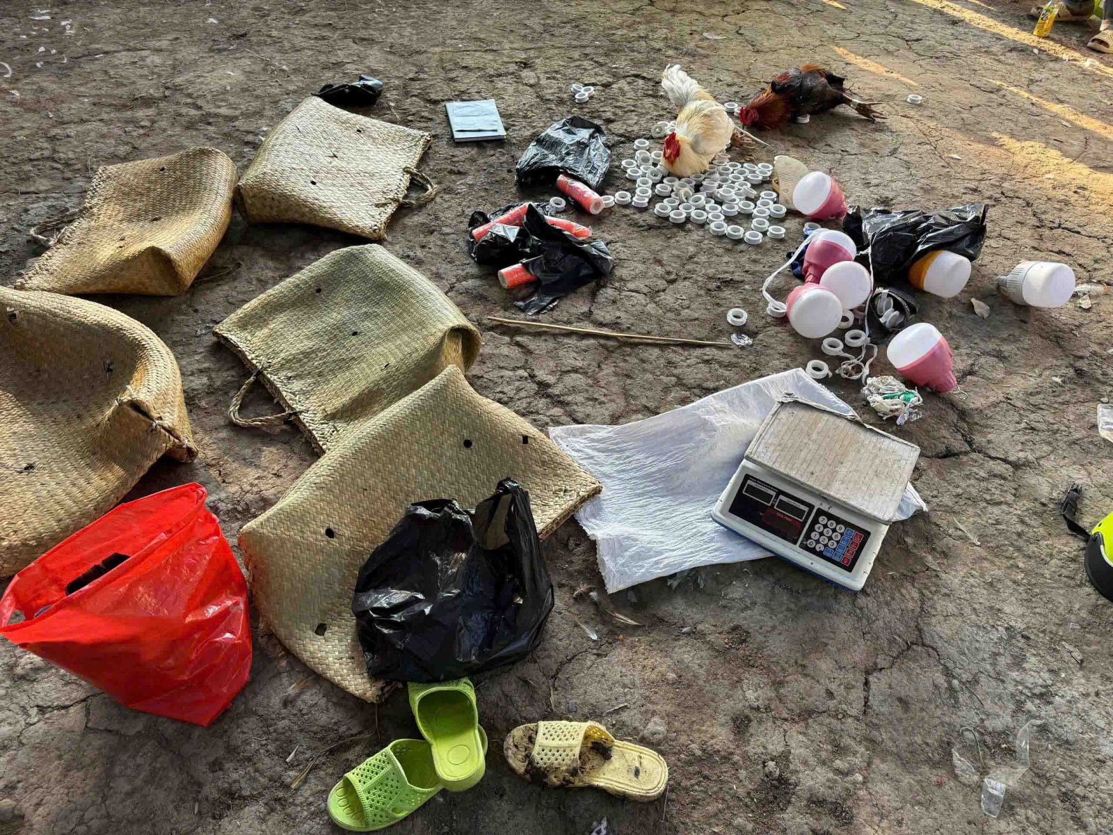 Tang vật tạm giữ tại hiện trường gồm 2 con gà, nhiều cặp cựa sắt, 1 cân đồng hồ, 10 điện thoại di động, 30 xe mô tô cùng số tiền trên người nhóm đối tượng là hơn 13 triệu đồng.