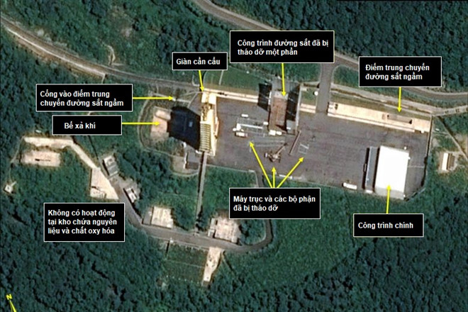 Trang 38 North đồng thời khẳng định việc thi công các công trình đường sắt tại bệ phóng ở trung tâm Sohae đã bị ngừng, nhưng chưa rõ việc xây dựng này là nhằm phá hủy hay sửa chữa.