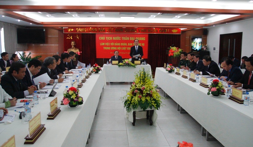Tại buổi làm việc, Chủ tịch nước Trần Đại Quang nhấn mạnh về bối cảnh đất nước hiện nay đang đứng trước nhiều thời cơ, thuận lợi nhưng cũng nhiều khó khăn, thách thức. “Do đó, trong niềm vui mừng, chúng ta cũng phải xác định rõ vị trí, nhiệm vụ, vai trò của mình, trong đó có Hội Luật Việt Nam để tạo niềm tin mới, quyết tâm mới, đạt được những mục tiêu của Nghị quyết Đại hội 12 của Đảng đã đề ra”, Chủ tịch nước nhấn mạnh.