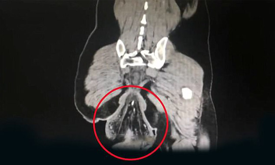 Tại bệnh viện, các bác sĩ cho biết phần dị vật có hình dạng khối u này chính là trực tràng đã mất sự gắn kết với cơ thể nhưng vẫn còn bám vào hậu môn.