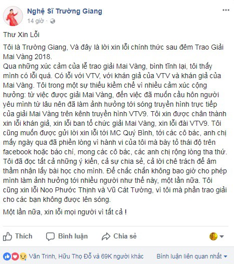 Trên trang cá nhân, danh hài Trường Giang đăng bức thư xin lỗi khá nghiêm túc. Anh lần lượt nhắc tới từng người bị ảnh hưởng trong đêm trao giải Mai Vàng như MC Quý Bình, nhà đài VTV9, ban tổ chức giải cho và các khán giả truyền hình.
