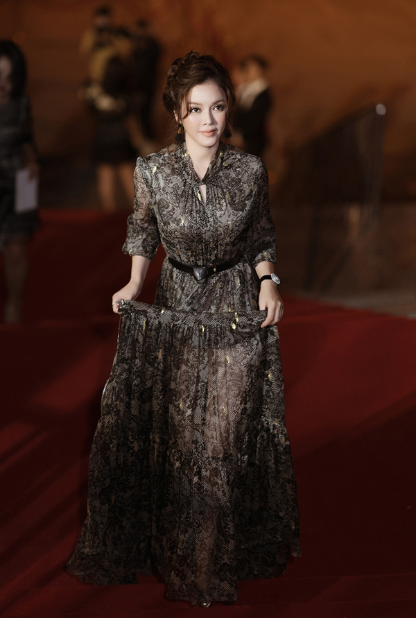 Lý Nhã Kỳ cũng bay ra Hà Nội để làm khách mời trong show thời trang tối qua. Lãnh sự danh dự Rumani chọn bộ đầm họa tiết thướt tha, kết hợp cùng phụ kiện kim cương đắt đỏ như đồng hồ, hoa tai, nhẫn.